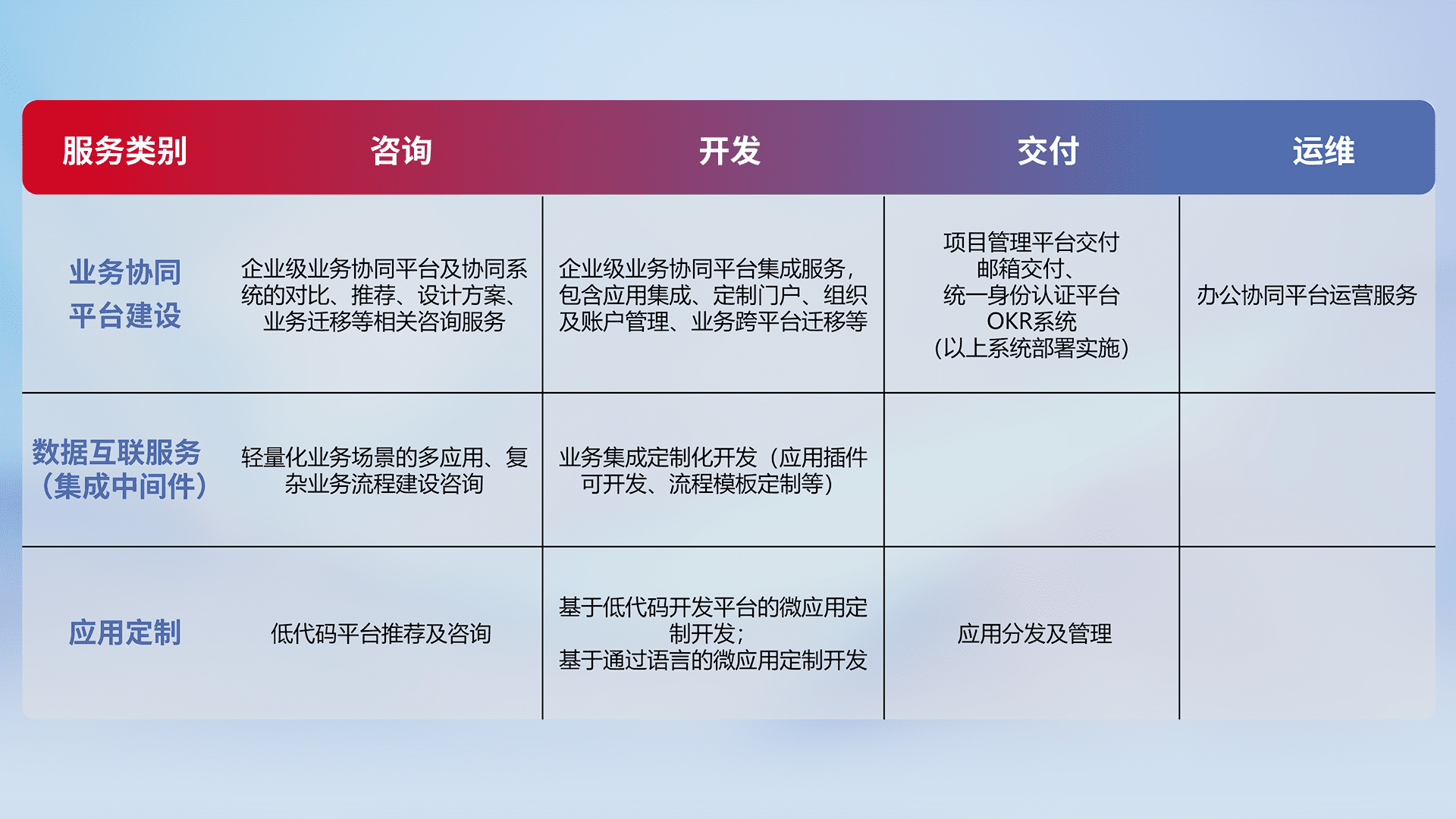 针对钉钉、、、企微、、IDaas等平台级产品提供产品的规划、、、方案、、交付、、定制化开发等服务,,实现如统一协同办公、、、、智能客户服务、、混合会议管理、、智能数据查询、、、、等业务场景,,实现数字化转型。。。