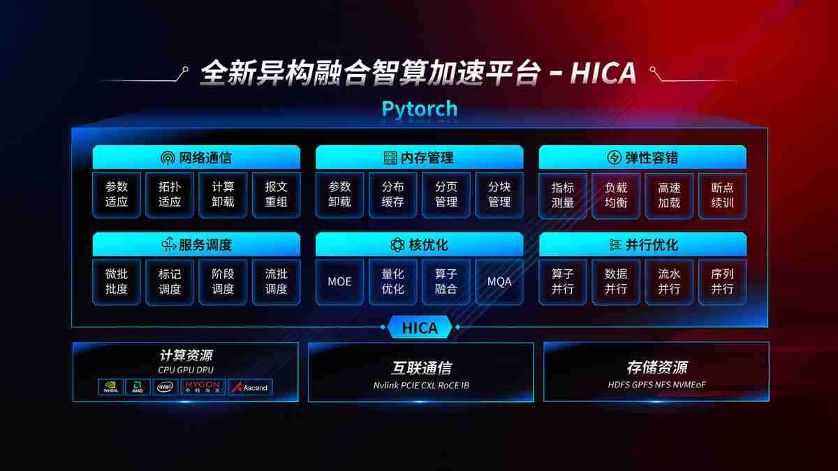 通过自研的服务层、、中间适配层、、、以及调度编排算法,,采用数据并行、、模型并行等多种并行方式,,把并行计算任务进行有效的分解,,使其分别由相应的软件栈和算力资源来承接。。当GPU资源变化,,,HICA可以实时动态调度计算子任务并调整模型拓扑和架构,,,以充分聚合各种算力资源。。。