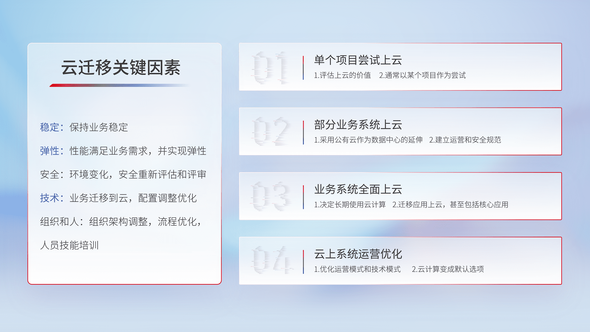 结合实际业务,,,从规划设计、、、、云平台选型、、、云原生改造、、、数据迁移、、集成交付,,,,迁移全过程为客户识别最佳上云路径,,,,做好风险识别管理,,,设计网络架构、、、身份权限、、、、安全审计合规、、、操作审计、、、日志审计、、监控告警策略、、、、多站点容灾设计等,,,对云上基础设施进行整体规划,,提升IT治理水平,,,,以满足弹性、、、高可用、、、高性能的需求。。。。