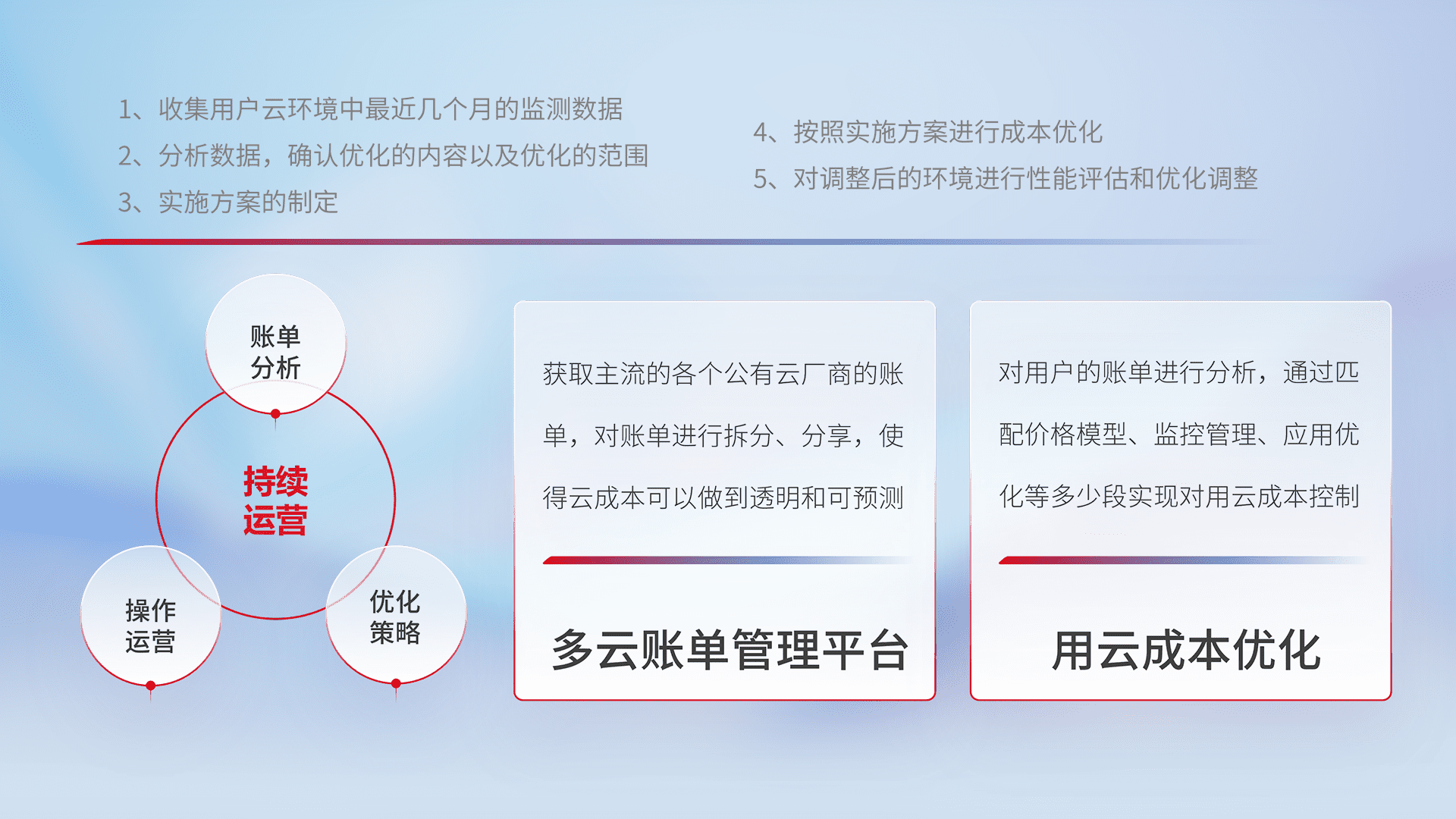 通过多云纳管,,,,以统一的资源数据模型把客户的云资源进行抽象和封装,,,进而实现对多云资源的统一操作,,,,保障云资源管理的可靠性、、稳定性与可用性。。。量身定制化运维内容,,,,配置、、、、开发运维、、补丁管理、、、备份、、监控、、、、认证和访问管理、、审计和日常巡检等,,,,保障在用云过程中的可靠度,,稳定度以及高可用率。。。。